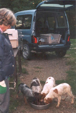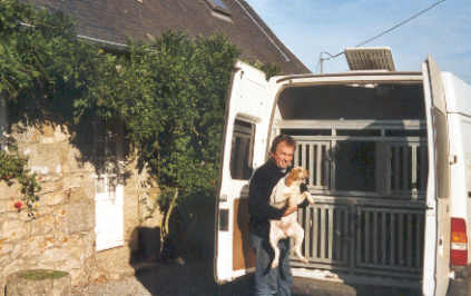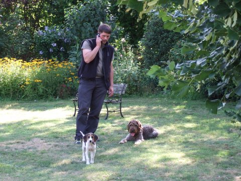Boris Riab, by the Dr Jacques Bourdon Puppies en route for the new world.. In October 2003, we made a big shipment of puppies to different parts of the world. Two left by car to Spain and to England. Four took planes to the USA (2 of them), Canada and New Zealand. Incidentally a white orange male stayed with me as I had just tragically lost my beloved pointing griffon Jumbo. Sanitary requirements The puppy must have been vaccinated at the age of 3 months, and can only be shipped one full month later. In other words the young dog will be at least 4 month old when he will fly to or with you. Choosing the puppy We obviously recommend to do this during a short visit trip to Brittany. There are two ways to do it: Either visiting when very young puppies are available and arrange a shipment later at the legal age. Otherwise you can also book an youg pup and come at the 4 month anniversary to check if this is what you really wanted. At this stage you can bring back your dog and make it travel with you. The plane ticket of a dog traveling along with his (new) master is 150 euros, to which you must also add the price of an air-cage, except if you bring your own. Price example of a puppy shipped to Atlanta - Vaccinated puppy, 1.000 euros Greetings The letter below is from a famous American outdoors writer reporting on his puppy just 3 months after he received it. In fact this letter was the answer to my Season's greetings early January 2004.