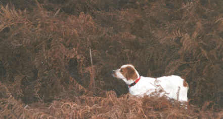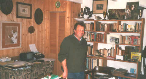 Images of the Oct 2003 trip Hervé at his desk. In the shelves are kept details of all the dogs sold by the kennel including records of all the dogs that left for the New World since 1903. There are de Cornouaille ancestors in most lines of American or Canadian Brittanies (In most other countries where Brittanies are used also). A farewell kiss before taking the road to Paris At home near Paris a couple of days transit before CDG airport. From left to right tricolore male en route to Texas, roan and liver male for Canada, white orange female for "traditional Southern quail" in Florida and my own white orange male. Missing the 8 month old white orange male for New Zealand. Being much bigger he was not allowed to eat with the young class. The 3 main shades of colours. Missing the white orange roan (with less bright white parts). Uzès, Umaha and Uhlan. Americans are always intrigued by the fact that we use a letter system to name our dogs. Each year has its letter. These were "U's". It is very useful later in hunter's conversations. For instance, if someone speaks of a bitch named Jodie, I will know right away that she was the same age of my late Jumbo. My own male Uzès, just a few days after the pictures above, in other words at 4 months and 10 days. I was at a driven partridge shoot near the Loire châteaux and took him out after the shoot to see if he would be interested by the birds. There was plenty of them in the woods bordering the fields of the shoot. At first scent he went into the brush and seriously pointed something in the high ferns. I joined him took this picture and flushed a beautiful flock of redlegged partridges. I found it very promising for such a young boy. *