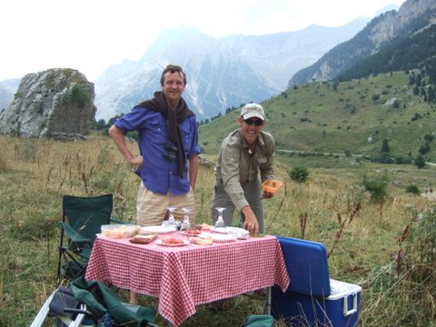 The Pyrenees of Aragon ... With or without Ivan Tarin Let me introduce Ivan (and a decent trout) Fish species:, You will mostly fish dry flies on mountain streams, brown trout. Sometimes you will meet the famous "zebra" trout, and you may be introduced to the now famous "perdigon" Spanish nymph. Higher stretches and altitude lakes offer nice brookies (salvelinus), and some lower stretches trophy rainbows. Over the years, with his organization "Salvelinus", Ivan Tarin has become the new king of Aragon. A much deserved success and if you want me to include in your trip a few days with them I will always be happy. But if you prefer something more classic, simpler and less expensive like just a night at a nice small mountain hotel and a guided day to get started, and simply fish on your own I'll be also very happy to offer this great alternative. Even if you prefer to do it fully 'self guided' following my directions and instructions. Aragon as on pictures below, offers breathtaking landscapes, pristine streams, rich fauna, old stone villages, a feel of history and a heart touching character. Pamplona Pamplona is actually in Navarre, but can be a good start to your trip. There is an airport in Pamplona with flights from the major other Spanish airports. You can spend there your first or last night. Pamplona needs no introduction among the readers of Hemingway, and the lovers of the San Fermines fiestas... The view from your hotel room in Pamplona The famous café Iruña, one of the best..... breakfast place ! in the world... All the region is a highlight stage on the pilgrimage to Santiago de Compostela A nice village "cutting" the road between Pamplona & our fishing spots of Aragon. Mountain landscapes....The Pyrenees of Aragon, & (small on the right), a medieval castle defending the valley unspoiled valleys and driving down back to the lodge at the end of the day... Rich fauna.... Marmots, chamois & large birds of prey can be observed with binoculars... Hopefully not many cars take this road, and ours are often "off road"... Stunning streams & crystal clear waters...Ivan is proud to show you these wonderful spots Old stones & rich culture...Each of these small mountain villages has an old church... and a picturesque old centre to visit sometimes with a nice bar or restaurant Great Spanish life & gastronomia... The bar at the lodge is the place for night caps & never ending fishing controversies... Grand Style picnics are served in the mountain to "cut" the fishing day the food is sometimes cooked on open fires of traditional country houses ... and shopping in the very attractive neighbour town of Jaca Prices As said above, we will put a price