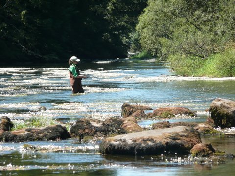 A (very) good trout caught at the "small night club"by my brother in Jul 2009 And nice a back-season one by great Canadian angler Mike Seebach in late Sept 2009 Reputed brown trout & grayling fishing There are 5 rivers of easy reach, some easy, some very sportif flowing across deep gorges. The trout season runs from March 15th to September 20th. Grayling starts by late May and can be fished until the end of October. (Fall is a nice occasion to plan a mixed trip: Bordeaux vineyards during harvest followed by a fly fishing escapade in Dordogne). The tributaries of the Dordogne are excellent early starting streams for March or April. The Dordogne is a big river (sometimes 80 to 100 meters), tough and very wide. Wading pants with felt soles are required. Using a professional guide is a key to success, but we can tell you where to go to observe the local sportsmen, before fishing on your own. The Dordogne is an excellent grayling stream Landscapes Each town is a jewel. Valley are bordered by meadows and century old walnut orchards, surrounded by rocky wooded hills. Climate is dry and warm. At the end of the summer may appear the first cèpes mushrooms. Accomodation Our first choice hotel is a